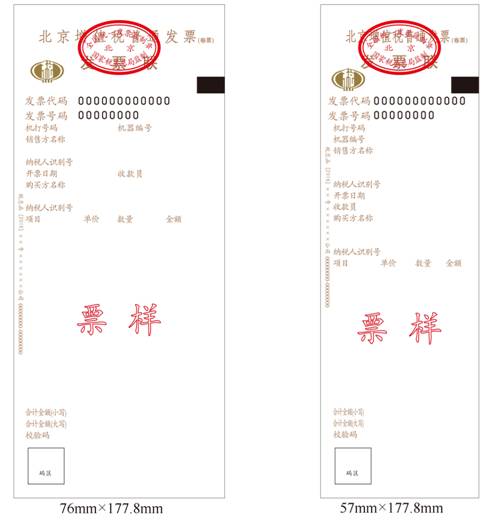 发票分两种规格:57mm×177.8mm、76mm×177.8mm,均为单联。发票代码为12位,发票号码为8位。